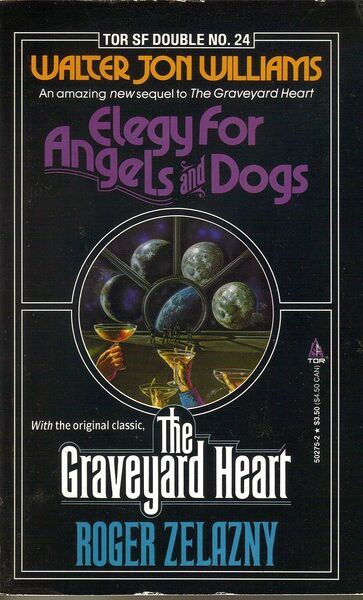 1990’s Elegy for Angels and Dogs /The Graveyard Heart was the twenty-fourth Tor SF Double. Originally published in 1964, The Graveyard Heart is by Roger Zelazny. Originally published in 1990, Elegy for Angels and Dogs is by Walter Jon Williams. Both stories take place in Zelazny’s Party Set milieu.