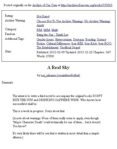 tori_siikanen’s A Real Sky is an unfinished novel, readable at Archive of Our Own. It attempts to give Tanith Lee’s Don’t Bite the Sun and Drinking Sapphire Wine duology a concluding volume.