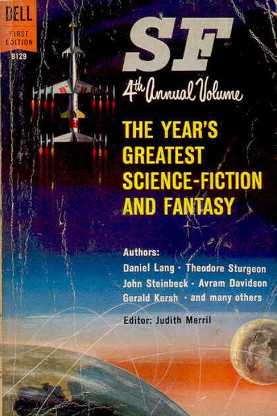 1959’s SF: The Year’s Greatest Science Fiction and Fantasy: 4th Annual Volume (also published as SF:’59: The Year’s Greatest Science-Fiction and Fantasy) is the fourth volume in Judith Merril’s The Year’s Best SF anthology series. It collects the best short fiction, essays and associated poetry from 1958.