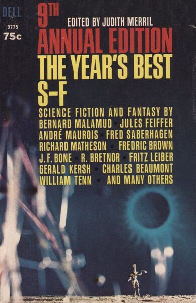 The 9th Annual of the Year’s Best SF is, as one might guess, the ninth volume in Judith Merril’s The Year’s Best S‑F Series. The anthology was also published as 9th Annual Edition: The Year’s Best S‑F, 9th Annual S‑F, and The Best of Science Fiction 9. Merril’s anthology collects outstanding short works of science fiction from the previous year, which in this case stretched from 1959 to 1963.