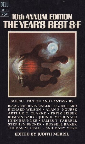 1965’s 10th Annual Edition: The Year’s Best S‑F is the tenth volume in Judith Merril’s The Year’s Best S‑F reprint anthology series. 10th Annual Edition was also published as 10th Annual S‑F and The Best of Science Fiction 10. Best SF annuals present a selection of the best SF from the previous year. In this case, that year stretched from 1946 to 1964.
