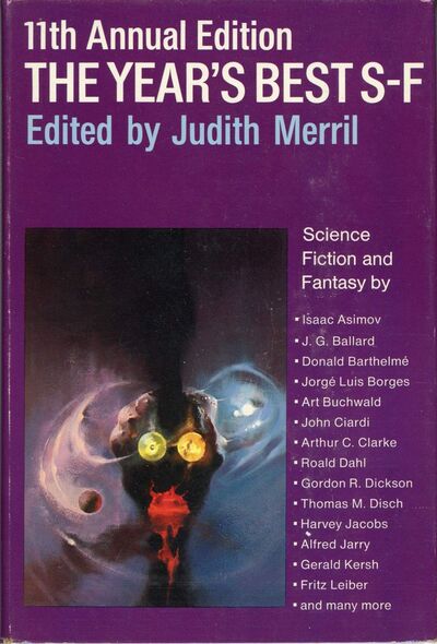 1966’s 11th Annual Edition: The Year’s Best S‑F is the 11th volume in Judith Merril’s The Year’s Best S‑F series. Unlike previous volumes, 11 does not seem to have had variant titles (or many editions, for that matter). The anthology offers the best stories of the previous year, which in this case stretched from 19621 to 1965. Almost all of the stories are from 1965.
